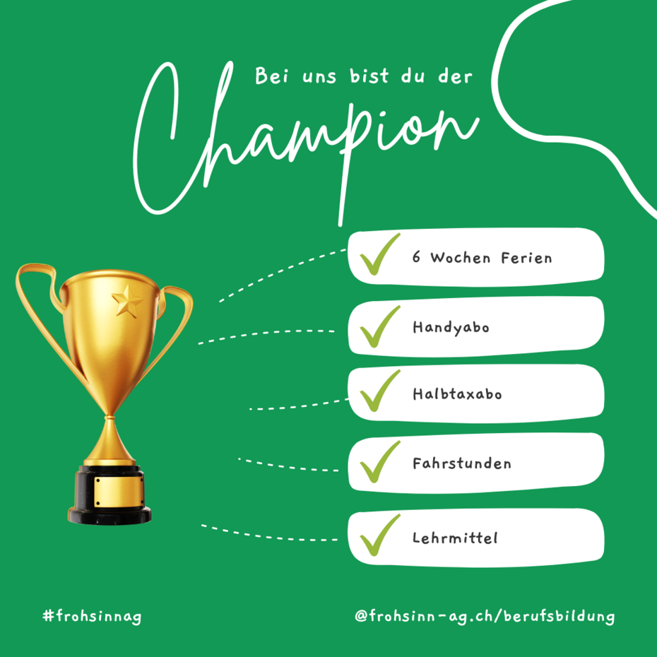 Das Zentrum für aktives Alter Frohsinn AG setzt sich für die Berufsbildung von jungen Nachwuchskräften ein und möchte das Wissen und die Fähigkeiten der Mitarbeitenden weitergeben und dir damit eine positive Zukunftsperspektive geben.